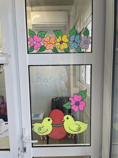 Η υπάλληλος της 6ης ΥΠΕ Βασιλική Αρταβάνη με την πολύτιμη βοήθεια του πατέρα της, γνωστού Πατρινού εικαστικού Κωνσταντίνου Αρταβάνη, ανέλαβαν να ομορφύνουν και να ζωγραφίσουν γυάλινες επιφάνειες της νοσηλευτικής μας μονάδας ώστε οι μικροί ασθενείς και οι οικογένειές τους, να αισθανθούν όσο γίνεται καλύτερα τις μέρες του Πάσχα.