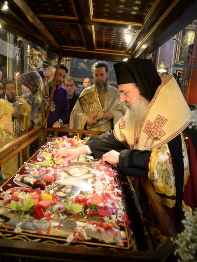 Ὁ Σεβασμιώτατος μετά τό πέρας τῆς ἱερᾶς Ἀκολουθίας ἐπεσκέφθη Ἱερούς Ναούς τῆς πόλεως, προκειμένου νά προσκυνήσῃ τούς Ἱερούς Ἐπιταφίους καί νά εὐχηθῇ στούς Ἱερεῖς καί τό προσωπικό τῶν Ναῶν, πανευφρόσυνο Πάσχα.
