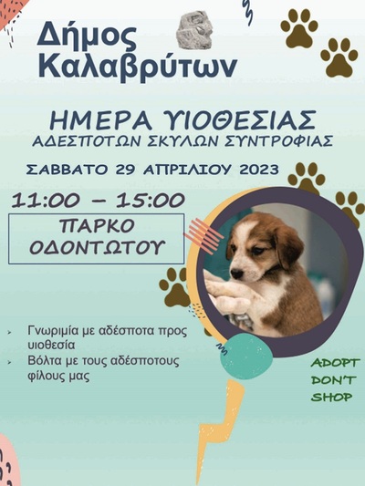 Έτσι η εκδήλωση θα πραγματοποιηθεί το Σάββατο 29 Απριλίου, ώρα 11.00 π.μ. έως 15.00 μ.μ., στο Πάρκο του Οδοντωτού σιδηρόδρομου στα Καλάβρυτα όπου όσοι πάνε θα έχουν την ευκαιρία να δουν από κοντά και να γνωρίσουν τους μικρούς αδέσποτους φίλους μας.