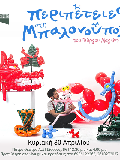 H χαριτωμένη παιδική παράσταση «Περιπέτειες στη μπαλονούπολη» - the balloon show, με τον Γιώργο Μαγκίνη πρόκειται να παρουσιαστεί ξανά στο θέατρο act (σκάλες Γεροκωστοπούλου 65, στην Πάτρα) την ερχόμενη Κυριακή 30 Απριλίου 2022 στις 12.30 το μεσημέρι και στις 16.00.