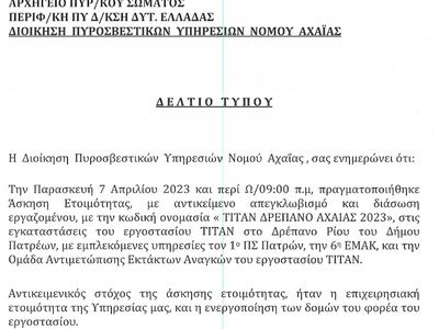 Η άσκηση με την κωδική ονομασία «ΤΙΤΑΝ Δρέπανο Αχαΐας 2023» πραγματοποιήθηκε στις εγκαταστάσεις του εργοστασίου ΤΙΤΑΝ στο Δρέπανο του Δήμου Πατρέων.