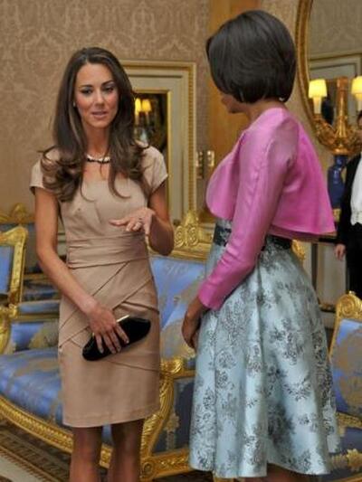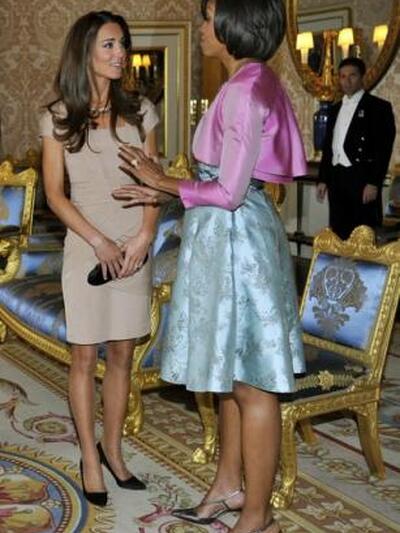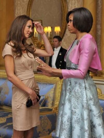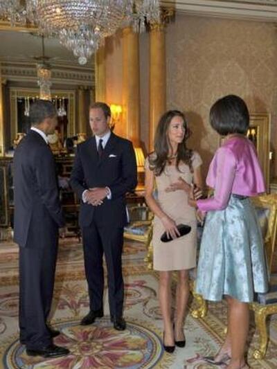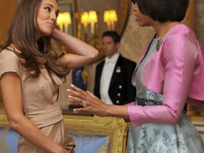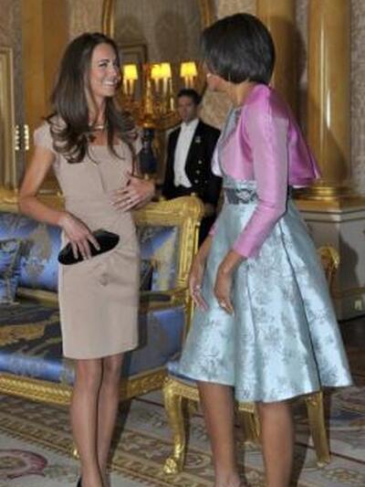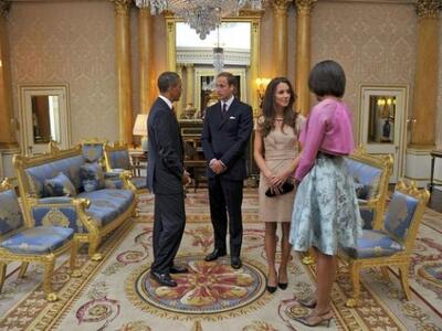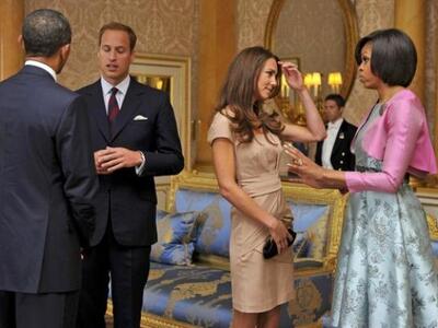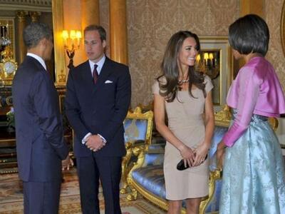 Φρενίτιδα προκάλεσε στους φωτογράφους η συνάντηση του προεδρικού ζεύγους της Αμερικής Μπαράκ και Μισέλ Ομπάμα με τους νεόνυμφους Γουίλιαμ και Κέιτ στο Λονδίνο. Τις εντυπώσεις έκλεψε η νέα δούκισσα του Κέμπριτζ, Κέιτ Μίντλετον, η οποία πιστή στο ενδυματολογικό στυλ που έχει υιοθετήσει επέλεξε μια ηπίων τόνων και χαμηλού κόστους δημιουργία.