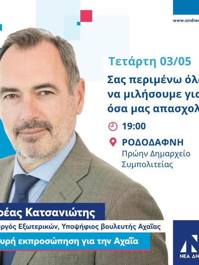 "Στη Ροδοδάφνη, την Τετάρτη 3 Μαΐου 2023 στις 7:00 το απόγευμα και στο Πρώην Δημαρχείο Συμπολιτείας (Αίθουσα Συνεδριάσεων) δίνει το ραντεβού του με τους πολίτες της Δημοτικής Ενότητας Συμπολιτείας του Δήμου Αιγιάλειας ο υφυπουργός Εξωτερικών και υποψήφιος Βουλευτής Αχαΐας της ΝΔ, Ανδρέας Κατσανιώτης.