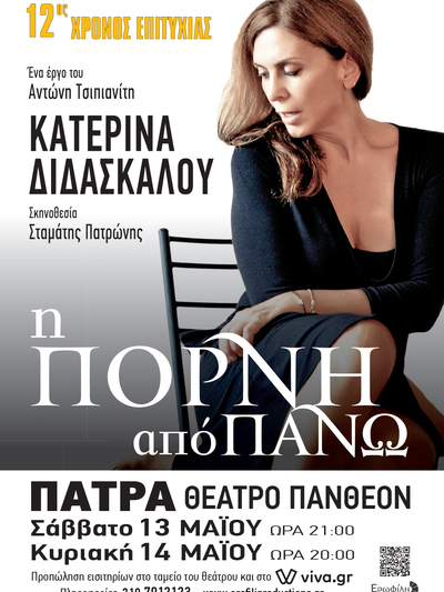 Η παράσταση «Η πόρνη από πάνω» που έχει συμπληρώσει 12 χρόνια συνεχούς επιτυχίας, με την Κορίνθια ηθοποιό Κατερίνα Διδασκάλου που φέτος την βλέπουμε στο ρόλο της ηγουμένης ενός μοναστηριού στο επιτυχημένο σήριαλ του Mega, “Το Μαύρο Ρόδο”, πρόκειται να παρουσιαστεί στην Πάτρα Σάββατο 13 Μαΐου 2023 στις 21.00 στο Θέατρο Πάνθεον καθώς και την Κυριακή 14/5 στις 20.00.