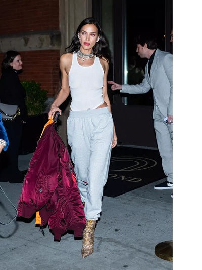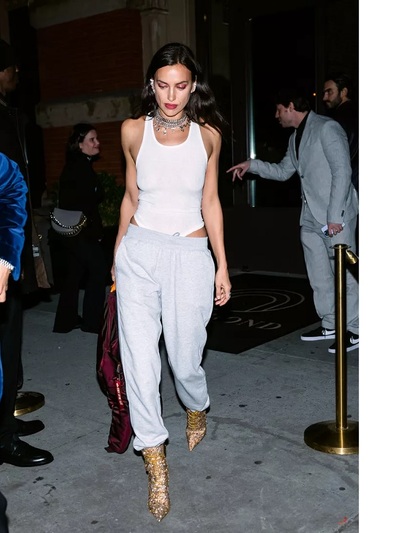 Εθεάθη με λευκό, πολύ απλό φανελάκι (χωρίς σουτιέν) και χαλαρό γκρι παντελόνι φόρμας. Αυτά τα τόσο καθημερινά ρούχα συνδυάστηκαν με εκθαμβωτικό τσόκερ Ana Khouri στο λαιμό και πολύ εντυπωσιακά, ψηλοτάκουνα μποτάκια από τη συνεργασία της Timberland με τον οίκο Jimmy Choo. Η Ιρίνα έκανε έτσι μια πρόταση για βραδινή έξοδο πάνω στην οποία μπορούμε να πειραματιστούμε όλες.