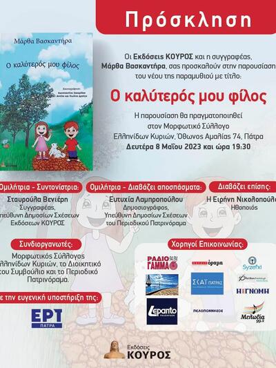 Τη Δευτέρα 8 Μαΐου 2023 και ώρα 7:30 μμ, προσκαλούνται τα μέλη και οι φίλοι του Μορφωτικού Συλλόγου Κυρίων Πάτρας σε εκδήλωση παρουσίασης βιβλίου.