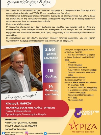 Αναλυτικά αναφέρει στη συνοπτική περιγραφή της κοινοβουλευτικής δραστηριότητας του, ως βουλευτής Αχαΐας του ΣΥΡΙΖΑ-ΠΣ, από την εκλογή του έως τώρα. "Προσπάθησα να ανταποκριθώ στις απαιτήσεις της συγκυρίας και στις προσδοκίες των μελών, φίλων του ΣΥΡΙΖΑ-ΠΣ και της κοινωνίας γενικότερα. Λειτούργησα διαδραστικά με τις θέσεις φορέων και συλλογικοτήτων, όπως και μεμονωμένων πολιτών.