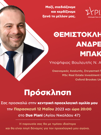 Θεμιστοκλής-Ανδρέας Μπάκας, στην κεντρική προεκλογική εκδήλωση του, αύριο Παρασκευή, 12 Μαϊου, στις 8 μ.μ., στο καφέ-ρεστοράν Due Piani (Αγίου Νικολάου 47).