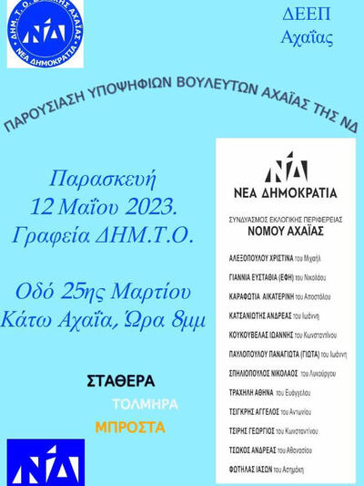 Εκδήλωση παρουσίασης των υποψηφίων βουλευτών της Νέα Δημοκρατίας θα πραγματοποιηθεί απόψε Παρασκευή 12 Μαΐου στις 8 το βράδυ στην οδό 25ης Μαρτίου στην Κάτω Αχαΐα.