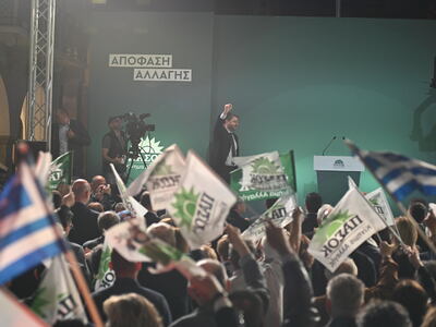 «Ήρθε η ώρα», συμπλήρωσε, «να φυσήξει ξανά, από άκρη σε άκρη της πατρίδας μας, νέος άνεμος αλλαγής, ανατρέποντας τους συσχετισμούς που κρατούν σε ομηρία κάθε δημοκράτη, κάθε προοδευτικό Έλληνα και που πάνω από όλα οδηγούν στον αφελληνισμό της ελληνικής οικονομίας».