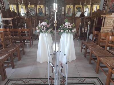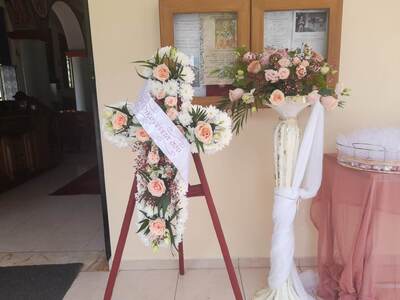Δίπλα στις μπομπονιέρες βρίσκονται στεφάνια με ροζ λουλούδια