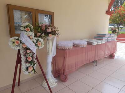 Δίπλα στις μπομπονιέρες βρίσκονται στεφάνια με ροζ λουλούδια και ένα μόνο κόκκινο τριαντάφυλλο μπροστά από την φωτογραφία του μωρού.