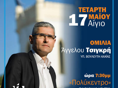 Ο υποψήφιος βουλευτής Αχαΐας της Νέας Δημοκρατίας (καθηγητής της Εγκληματολογίας) Άγγελος Τσιγκρής , την Τετάρτη 17 Μαΐου στις 7.30 μμ, θα μιλήσει στους πολιτικούς του φίλους και τα στελέχη της ΝΔ, στο Πολύκεντρο Πολιτιστικό Κέντρο στο Αίγιο (Μυρτιά Αιγίου).