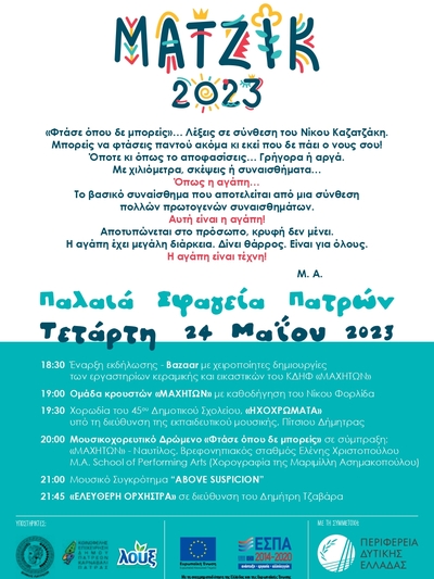 Οι « ΜΑΧΗΤΕΣ» με την υποστήριξη της Περιφέρειας Δυτικής Ελλάδας, για δεύτερη χρονιά, οργανώνουν την εκδήλωση ΜΑΤΖΙΚ 2023, την Τετάρτη 24 Μαΐου, ώρες 18:00 – 22:00, στα Παλαιά Σφαγεία της πόλης.