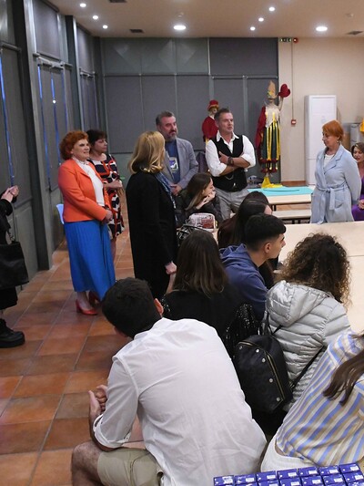 Στη συνέχεια επισκέφθηκαν την αίθουσα των δημιουργικών εργαστηρίων (ΝΚ1), όπου η Πρόεδρος της ΚΕΔΗΠ-Καρναβάλι Πάτρας Ήρα Κουρή τους καλωσόρισε και τους μίλησε για το Πατρινό Καρναβάλι, για τη λειτουργία του πολυχώρου των Παλαιών Σφαγείων, τον ρόλο της Δομής Προώθησης Πολιτιστικής Κληρονομιάς, τα εκπαιδευτικά προγράμματα, τα εργαστήρια, τις κατασκευές μάσκας, τη σχέση με την Απουλία μέσω του προγράμματος Sparc καθώς επίσης και την μελλοντική συνεργασία στο επόμενο Πατρινό Καρναβάλι με το Βιαρέτζιο και το φημισμένο Καρναβάλι της πόλης.