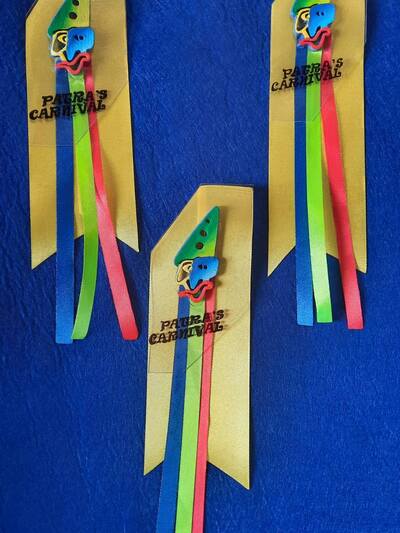 Τα αναμνηστικά-καρφίτσες δημιουργούνται με τη σύγχρονη τεχνική 3D printing (τρισδιάστατης εκτύπωσης) σε σχεδίαση του Δημήτριου Βάρδα, ο οποίος προσάρμοσε δημιουργικά στο ψηφιακό, τρισδιάστατο σχέδιό του το εμπορικό σήμα του Πατρινού Καρναβαλιού και παραχώρησε δωρεάν το σχέδιό του στην ΚΕΔΗΠ-Καρναβάλι Πάτρας για την αναπαραγωγή των αναμνηστικών. Η καρφίτσα επιζωγραφίστηκε από εργαζόμενη-εικαστικό της Δομής προώθησης πολιτιστικής κληρονομιάς του Δήμου Πατρέων.