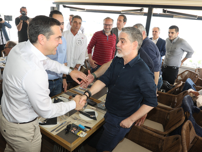 Αισιόδοξος για το αυριανό αποτέλεσμα ο Αλέξης Τσίπρας υποδέχτηκε τους πολιτικούς συντάκτες που καλύπτουν το ρεπορτάζ ΣΥΡΙΖΑ-ΠΣ σε εστιατόριο στον Πειραιά, στην καθιερωμένη συνάντηση την παραμονή των εκλογών.