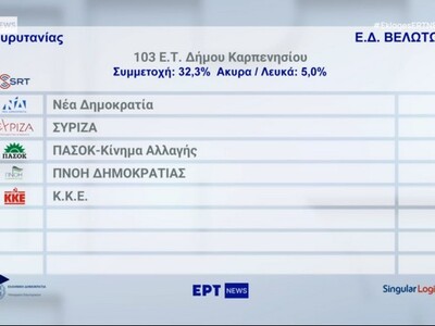 Στον δήμο Καρπενησίου έχουμε το πρώτο αποτέλεσμα της βραδιάς, με τη Νέα Δημοκρατία να προηγείται με 9 ψήφων έναντι 5 του ΣΥΡΙΖΑ .