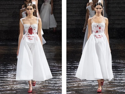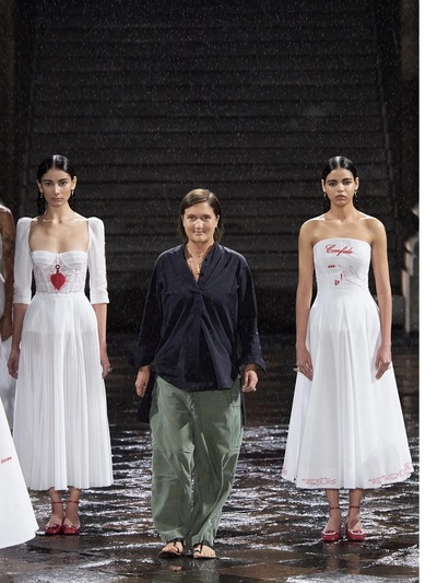 «Ειδωλο» χαρακτηρίζει την Φρίντα Κάλο η Chiuri. «Πολύ συνδεδεμένη με τη μητέρα γη και την ιδέα της μεταμόρφωσης. Ολο αυτό δεν είναι απλά δική μου δημιουργία. Αξίζει επειδή γινόμαστε όλοι μια κοινότητα» τόνισε στη Vogue. Στο φινάλε ξεπρόβαλαν λευκά φορέματα με κόκκινες «πινελιές» και συνθήματα για τα κοινωνικά μας τραύματα.