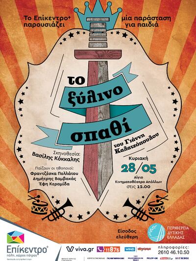 Η Περιφέρεια Δυτικής Ελλάδος παρουσιάζει την επιτυχημένη παράσταση "Το Ξύλινο σπαθί" του Γιάννη Καλατζόπουλου σε σκηνοθεσία του Πατρινού ηθοποιού Βασίλη Κόκκαλη στο γειτονικό Αίγιο. Το γεμάτο ουσία παραμύθι που ενθουσίασε μικρούς και μεγάλους όταν παίχθηκε στο Επίκεντρο+, παρουσιάζεται για μία μοναδική φορά στο Κινηματοθέατρο Απόλλων, στο Αίγιο την Κυριακή 28 Μαΐου 2023 στις 12 το μεσημέρι.