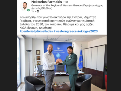 Ευχαριστώ θερμά τον Περιφερειάρχη Δυτικής Ελλάδος κο Νεκτάριο Φαρμάκη για την ευκαιρία που μου δίνει να εκφράσω το όραμά μου για την Περιφέρειά μας και να συμπορευτώ μαζί του.