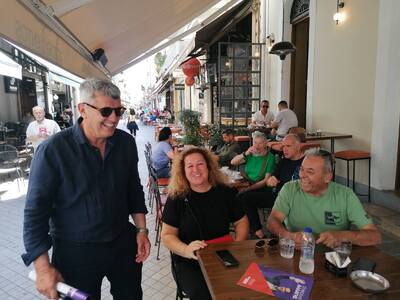 "Η περιοδεία στο κέντρο της πόλης ολοκληρώθηκε με την άφιξη του κλιμακίου στο ανανεωμένο εκλογικό περίπτερο του κόμματος στην πλατεία Γεωργίου το οποίο λειτουργεί κανονικά σε ώρες καταστημάτων.