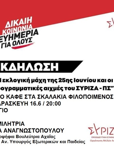 Στο καφέ στα "Σκαλάκια της Φιλοποίμενος" στο Αίγιο στις 16/6/2023, στις 20.00 με θέμα «Η εκλογική μάχη της 25ης Ιουνίου και οι προγραμματικές αιχμές του ΣΥΡΙΖΑ-ΠΣ»