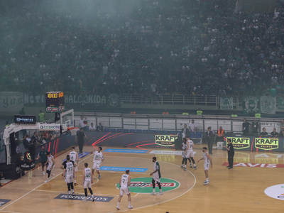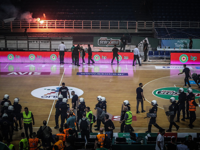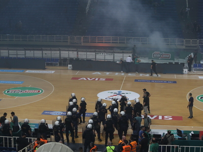 Μετά την απόφαση των διαιτητών να διακόψουν τον τέταρτο τελικό μεταξύ του Παναθηναϊκού και του Ολυμπιακού στο ΟΑΚΑ, αλλά και να εκκενώσουν το γήπεδο, οι οπαδοί του τριφυλλιού αντέδρασαν έντονα και άρχισαν να σπάνε καθίσματα και να προκαλούν διάφορες φθορές στο γήπεδο.