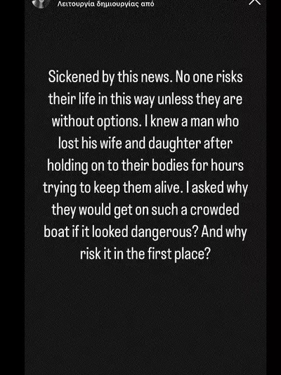 Αναρωτήθηκα γιατί θα ανέβαιναν σε ένα τόσο γεμάτο σκάφος αν φαινόταν επικίνδυνο. Και γιατί να το ρισκάρουν εξαρχής;», γράφει η διάσημη καλλονή, πρώην ειδική απεσταλμένη της Ύπατης Αρμοστείας του ΟΗΕ για τους Πρόσφυγες (HCR).