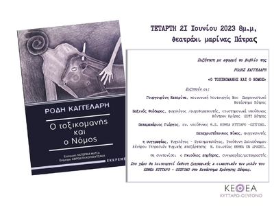 Την Τετάρτη 21/6/2023, 19:00-22:00, στο Θεατράκι Μαρίνας θα παρουσαιστεί το βιβλίο της Ρόδης Καγκελάρη «Ο τοξικομανής και ο νόμος»