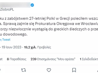 «Σε σχέση με τη δολοφονία μιας 27χρονης Πολωνής στην Ελλάδα, διέταξα έρευνα. Την υπόθεση θα χειριστεί η Επαρχιακή Εισαγγελία στο Βρότσλαβ. Οι εισαγγελείς θα ζητήσουν άμεσα στοιχεία από Έλληνες ανακριτές».