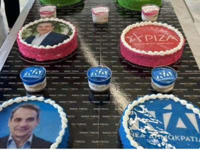 Γνωστό ζαχαροπλαστείο στον Εύοσμο, με αφορμή τις εθνικές εκλογές που βρίσκονται σε εξέλιξη, δημιούργησε τούρτες που μπορούν να αγοράσουν όλοι είτε είναι υποστηρικτές συγκεκριμένου κόμματος είτε όχι.