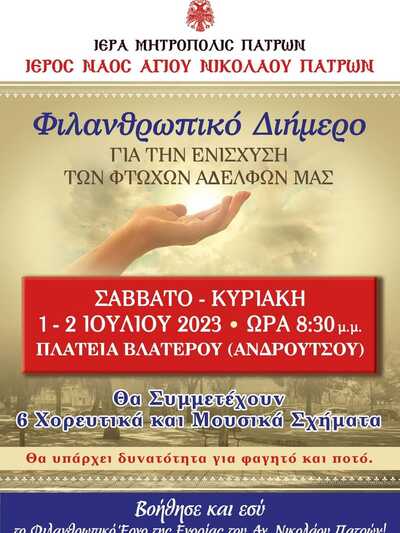 Με την ευχή και την ευλογία του σεβασμιοτάτου Μητροπολίτη Πατρών κ.κ. Χρυσοστόμου, ο ενοριακός ιερός Ναός Αγίου Νικολάου Πατρών, διοργανώνει για μια ακόμη χρονιά, το Σάββατο 1η Ιουλίου & την Κυριακή 2 Ιουλίου 2023 στις 8:30 μ.μ. ένα Φιλανθρωπικό Διήμερο στην Πλατεία Ανδρούτσου, στην γραφική συνοικία του Βλατερού, με σκοπό την ενίσχυση & στήριξη των εμπεριστάτων αδελφών μας.