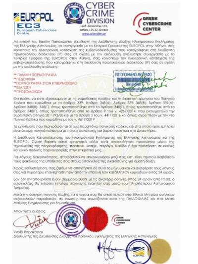 Πολλοί χρήστες του Διαδικτύου έχουν λάβει τις τελευταίες ημέρες στο email μια επιστολή που φέρει τις σφραγίδες της Europol και της Ελληνικής Αστυνομίας, που διακινείται ως δήθεν επιστολή του Διευθυντή της Διεύθυνσης Δίωξης Ηλεκτρονικού Εγκλήματος και τους εμπλέκει σε υπόθεση πορνογραφίας και σε άλλα αδικήματά.