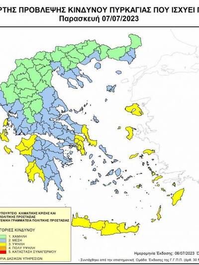 Σύμφωνα με τον χάρτη πρόβλεψης κινδύνου πυρκαγιάς, που εξέδωσε η Γενική Γραμματεία Πολιτικής Προστασίας, για την Παρασκευή 07/07/2023 προβλέπεται υψηλός κίνδυνος πυρκαγιάς (κατηγορία κινδύνου 3) στο Νομό Αχαΐας.