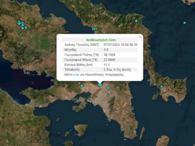 Σεισμική δόνηση μεγέθους 3 Ρίχτερ που σημειώθηκε λίγα λεπτά πριν τις 10.00 το βράδυ ταρακούνησε την Αθήνα.
