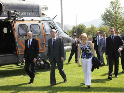 Ο Καναδός πρωθυπουργός μαζί με τον Έλληνα ομόλογό του Γ. Παπανδρέου, έφτασαν με ελικόπτερο στα Καλάβρυτα στις 10.30 το πρωί. Πρώτος σταθμός της επίσκεψης ήταν ο μοναστήρι της Αγίας Λαύρας, στο οποίο ξεναγήθηκαν από τον Μητροπολίτη Αμβρόσιο.