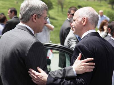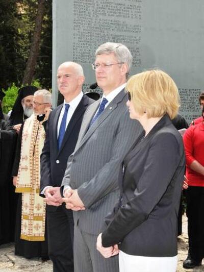 Με την κατάθεση στεφάνων εκ μέρους του Πρωθυπουργού και του Καναδού ομολόγου του Stephen Harper, ολοκληρώθηκε η επίσκεψη του Καναδού πρωθυπουργού , της συζύγου του Λορίν Χάρπερ και της συνοδείας τους στη μαρτυρική πόλη των Καλαβρύτων.