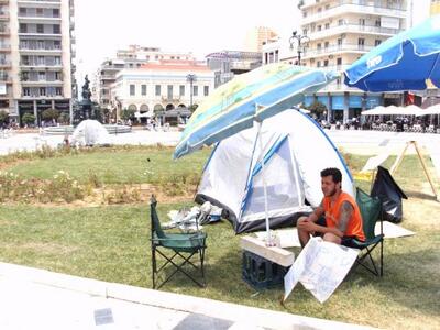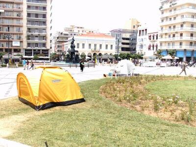 Μπορεί οι απογευματινές συγκεντρώσεις των Αγανακτισμένων Πολιτών της Πάτρας κάθε μέρα που περνάει να γίνονται όλο και πιο μαζικές, υπάρχουν όμως και κάποιοι που διαμαρτύρονται όλη την ημέρα. Πρόκειται για οχτώ άτομα που έχουν κατασκηνώσει στο κέντρο της πλατείας.