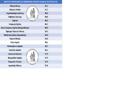 Πολύ υψηλές θερμοκρασίες σημειώθηκαν σήμερα 15/7 στη Δυτική Ελλάδα με τον υδράργυρο να ξεπερνάει σε πολλές περιοχές τους 40°C και στις περισσότερες να φθάνει και να υπερβαίνει τους 38°C.