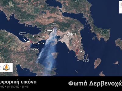 Δορυφορική εικόνα υψηλής ανάλυσης από τον Ευρωπαϊκό δορυφόρο Sentinel-3 το μεσημέρι της Τρίτης 18/07 αποκαλύπτει τη μεγάλη έκταση του πύρινου μετώπου στην δασική πυρκαγιά στα Δερβενοχώρια και τη Μάνδρα.