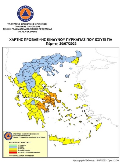 Σύμφωνα με την πρόβλεψη της Γενικής Γραμματείας Πολιτικής Προστασίας οι Π.Ε. Αχαΐας, Ηλείας, Αιτωλοακαρνανίας, εξακολουθούν να βρίσκονται στην κατηγορία 3 (υψηλή) σε σχέση με τον κίνδυνο πρόκλησης πυρκαγιάς, την Πέμπτη 20 Ιουλίου 2023, όπως φαίνεται στον επισυναπτόμενο ημερήσιο Χάρτη Πρόβλεψης Κινδύνου Πυρκαγιάς.