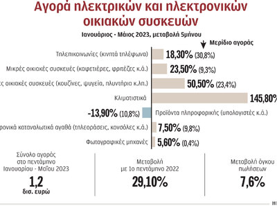 Σύμφωνα με την Καθημερινή, στο διάστημα Ιανουαρίου – Μαΐου 2023 ο τζίρος του κλάδου των οικιακών ηλεκτρικών και ηλεκτρονικών συσκευών αυξήθηκε κατά 29,1% σε σύγκριση με το αντίστοιχο περυσινό διάστημα και διαμορφώθηκε σε 1,2 δισ. ευρώ. Αύξηση που δεν ήταν μόνο πληθωριστική, αφού την ίδια ώρα αυξήθηκε και ο αριθμός των πωληθέντων τεμαχίων κατά 7,6%, όπως δείχνουν τα στοιχεία της GfK που παρουσιάζει σήμερα η εφημερίδα. Από την πανευρωπαϊκή έρευνα που πραγματοποιεί η GfK για τις καταναλωτικές τάσεις υπάρχουν ακόμη δύο ενδιαφέροντα στοιχεία που καθιστούν ελκυστική την ελληνική αγορά: