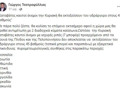 Στο ίδιο μήκος κύματος και ο μετεωρολόγος Γιώργος Τσατραφύλλιας ο οποίος σε ανάρτησή του στο Facebook εξηγεί ότι «καταβάτες καυτοί άνεμοι την Κυριακή θα εκτοξεύσουν τον υδράργυρο στους 45 βαθμούς».