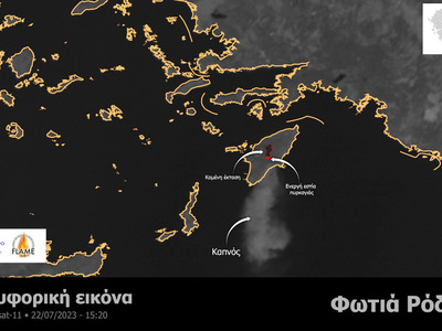 Στην επόμενη οπτική δορυφορική εικόνα του meteo.gr αποτυπώνεται, νωρίτερα το μεσημέρι (22.07.2023, 15:20), η μεταφορά του πυκνού καπνού από τους Β/ΒΔ ανέμους, χαρακτηριστικό δείγμα της έντονης καύσης λόγω των πολύ ξηρών και θερμών συνθηκών που επικρατούν στην περιοχή.