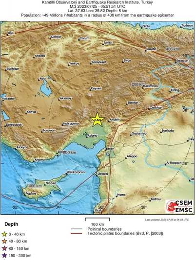 Σεισμική δόνηση ισχύος 5,5 βαθμών καταγράφτηκε στα Άδανα της Τουρκίας, σύμφωνα με το Ευρωμεσογειακό Σεισμολογικό Κέντρο (EMSC).