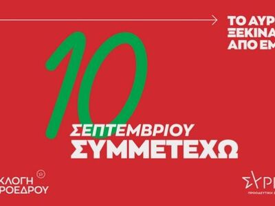 «10 Σεπτεμβρίου Συμμετέχω» είναι το κεντρικό κάλεσμα του ΣΥΡΙΖΑ - ΠΣ γιατί, όπως στοχεύει και η καμπάνια «Το αύριο ξεκινά από εμάς», αναφέρεται σε ανακοίνωση του κόμματος.