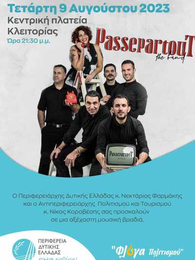 Η Περιφέρεια Δυτικής Ελλάδας - ΠΕ Αχαΐας διοργανώνει μουσική παράσταση με τους «Passepartout Band», την Τετάρτη 9 Αυγούστου 2023, στην κεντρική πλατεία της γραφικής Κλειτορίας του Δήμου Καλαβρύτων στις 21.30.