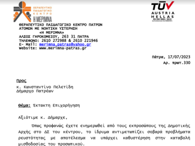 Η κατάσταση στην Μέριμνα είναι τεταμένη εδώ και καιρό λόγω διαφόρων προβλημάτων που αντιμετωπίζει το Ίδρυμα, όπου ο Δήμος Πατρέων ορίζει τα τρία μέλη του Διοικητικού Συμβουλίου. .