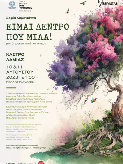 Η μονόπρακτη παιδική όπερα με τίτλο «Είμαι Δέντρο και μιλά» που είναι το νέο έργο μουσικού θεάτρου της ταλαντούχας συνθέτριας Σοφίας Καμαγιάννη, σε λιμπρέτο της Γιώτας Βασιλακοπούλου θα παρουσιαστεί στο Κάστρο της Λαμίας στις 10 και 11 Αυγούστου 2023, στις 9 το βράδυ, με ελεύθερη είσοδο για το κοινό. Η παραγωγή πραγματοποιείται στο πλαίσιο του προγράμματος 2023 του θεσμού "Όλη η Ελλάδα ένας πολιτισμός" του Υπουργείου Πολιτισμού.